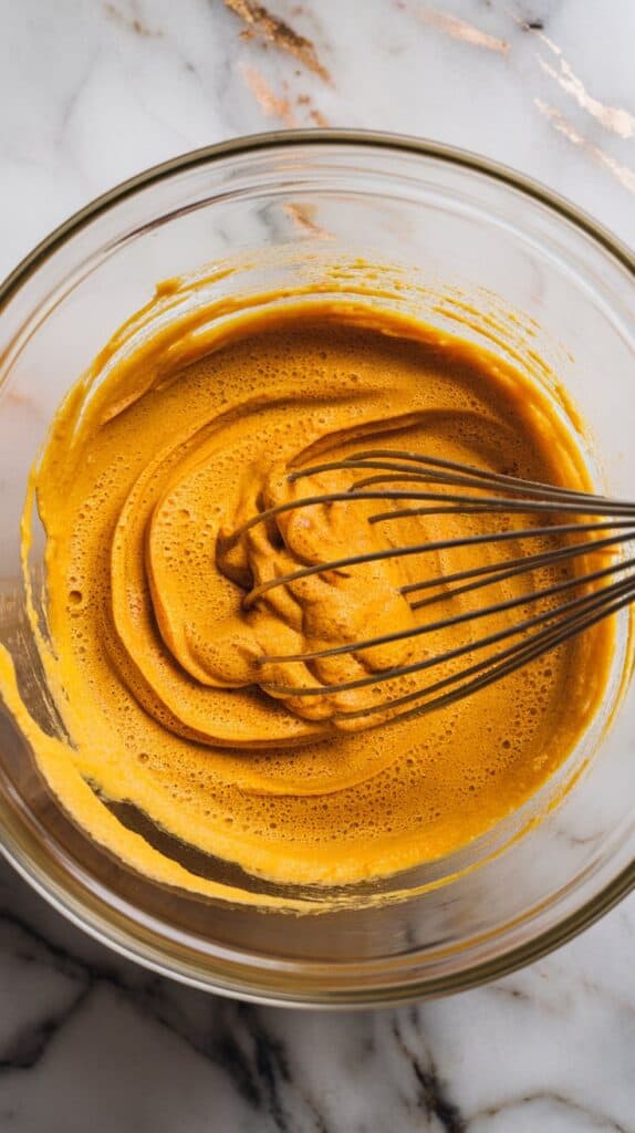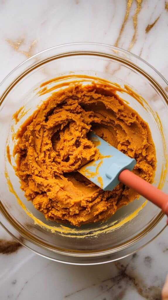 In a large bowl, whisk together 1/2 cup melted butter, 1/2 cup canned pumpkin puree, 1/2 cup brown sugar, 1/4 cup granulated sugar, 1 teaspoon vanilla extract, and 1 egg yolk until smooth.
