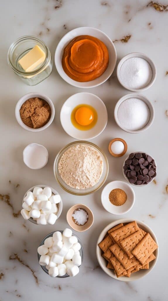 Pumpkin s’mores cookies are exactly what they sound like—soft, chewy pumpkin spice cookies packed with chunks of graham crackers, melty chocolate chips, and gooey marshmallows.