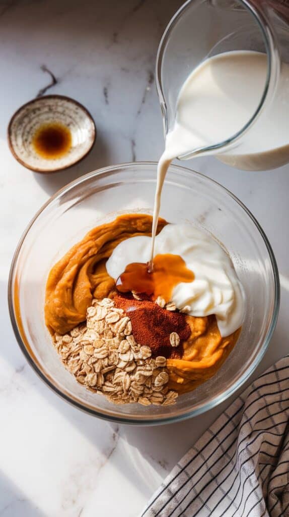 To the same bowl, add ¼ cup pumpkin purée, 2 tablespoons plain Greek yogurt, ½ cup milk, 1 tablespoon maple syrup, ¼ teaspoon vanilla extract, and the cooled 1 tablespoon of brewed coffee.