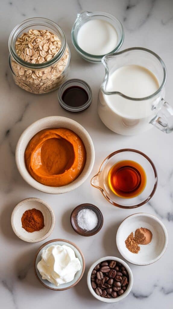 The oats soak up the liquid overnight, softening and thickening into a creamy, spoonable texture. The Greek yogurt adds a tangy richness and protein, while the pumpkin purée gives body and moisture. The coffee and spices infuse everything with that classic PSL flavor.