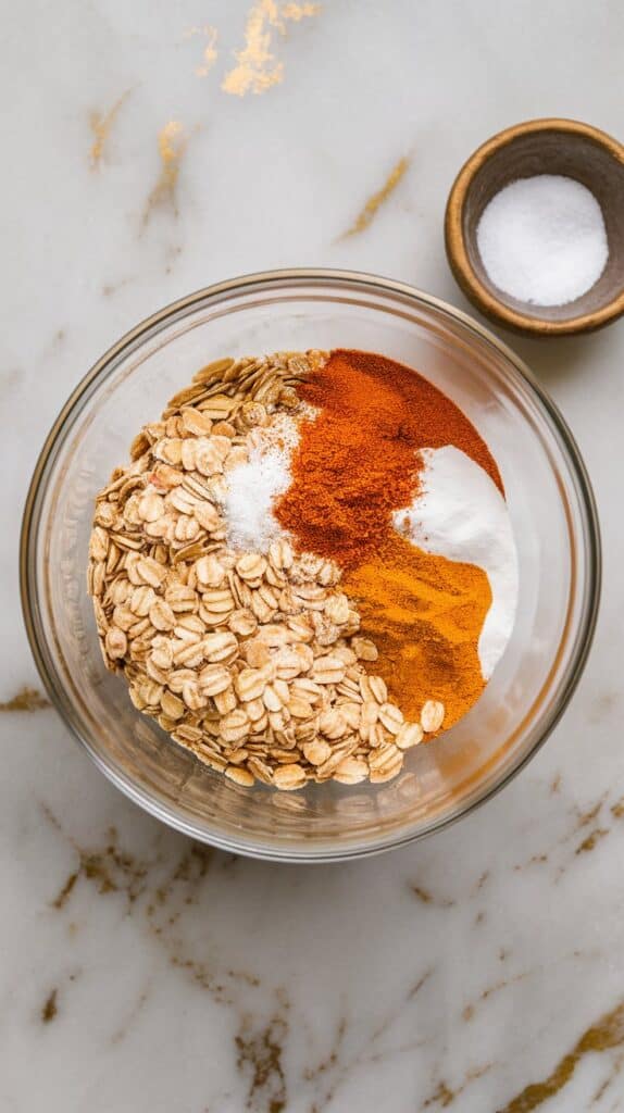 In a mixing bowl, add ½ cup old-fashioned rolled oats, ¼ teaspoon pumpkin pie spice, ⅛ teaspoon cinnamon, and a pinch of salt.
