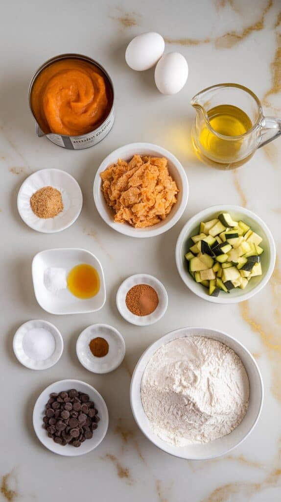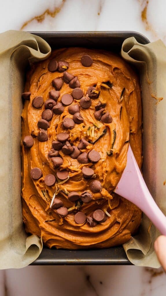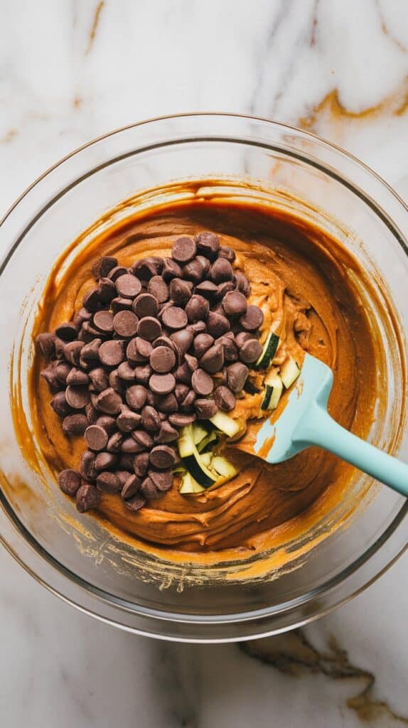 Pumpkin puree brings moisture and density. Zucchini adds structure and tenderness without altering the flavor. Oil keeps the crumb soft. The combo of baking powder and baking soda gives just enough lift. And chocolate chips? They just make everything better.