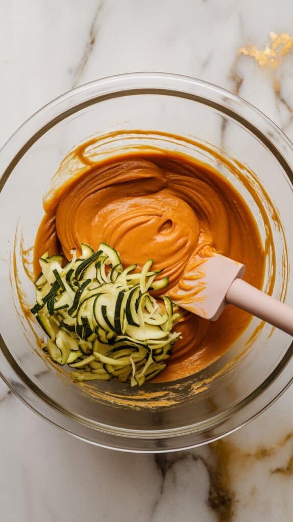 Fold in the 1 cup of squeezed, shredded zucchini to the wet mixture using a spatula.