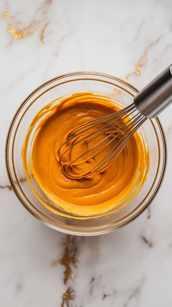In a large mixing bowl, whisk together 1 cup canned pumpkin puree, 2 large eggs, ½ cup vegetable oil, ¾ cup brown sugar, ¼ cup granulated sugar, and 1 tsp vanilla extract until smooth.