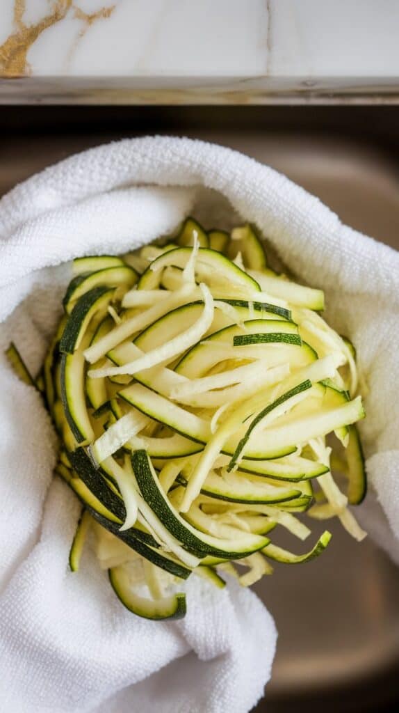 Grate 1 cup of zucchini using a box grater. Place it in a clean kitchen towel and squeeze out as much liquid as possible.