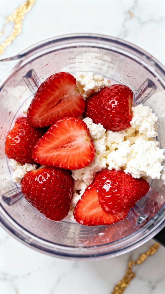 Ultra close-up shot of thick, creamy cottage cheese being spooned into the blender on top of the strawberries. You can see the texture of the curds. A straight 90-degree top-down shot with no tilt, captured directly overhead, on white marble with gold hints.