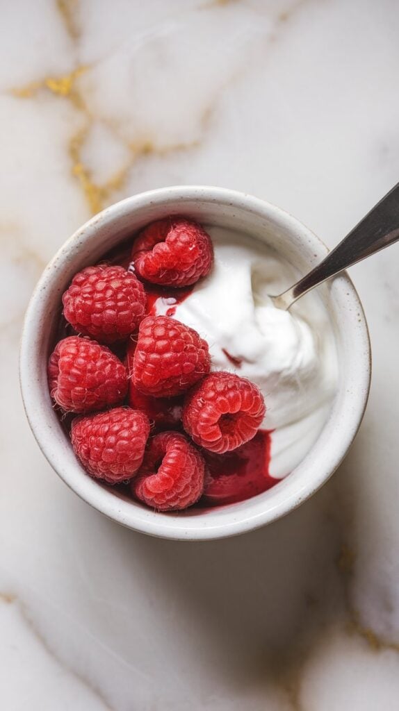 Gently place ½ cup fresh raspberries on top of the yogurt.
