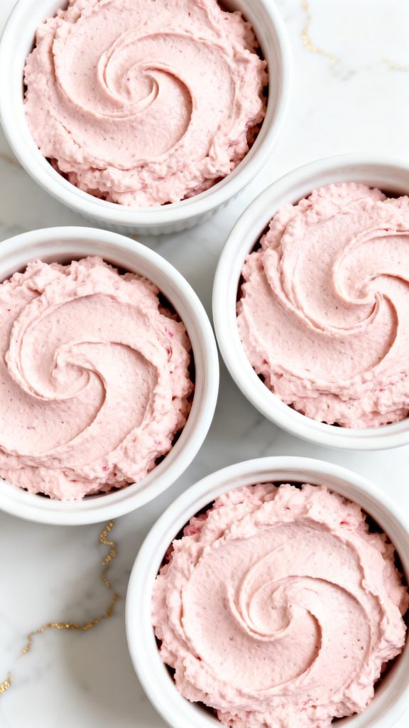 Place the 4 bowls of raspberry cottage cheese mousse in the refrigerator for at least 1 hour to firm up and deepen the flavor.