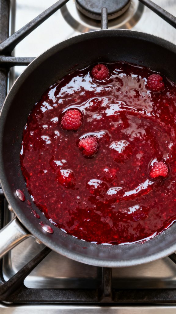 Add ½ cup fresh raspberries, ¼ cup water, and 2 tablespoons maple syrup to a small saucepan. Simmer for 15–20 minutes until raspberries are soft and broken down.