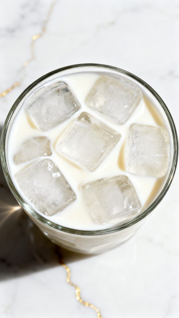 Fill a tall glass with ice cubes and pour in ½ cup milk.