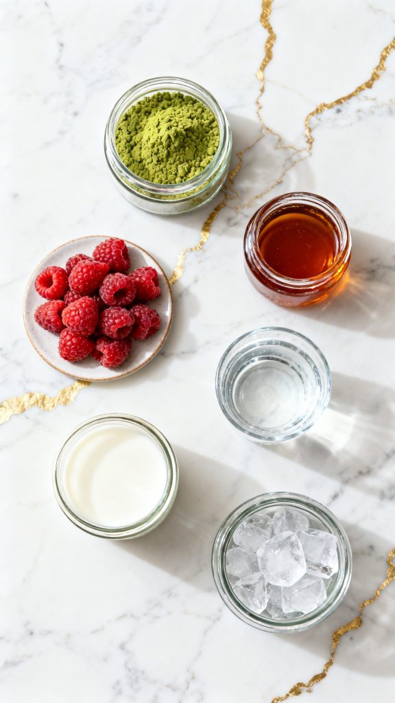 Matcha has fine particles that stay suspended, giving a smooth texture instead of separating like coffee. The density of raspberry syrup is higher than milk, so it sinks, while matcha sits on top—this creates those clean layers without much effort.