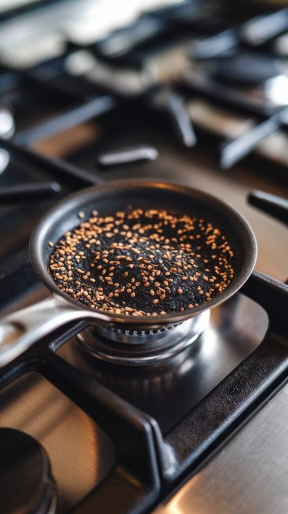 Toast the black sesame seeds in a dry pan over low heat until fragrant.