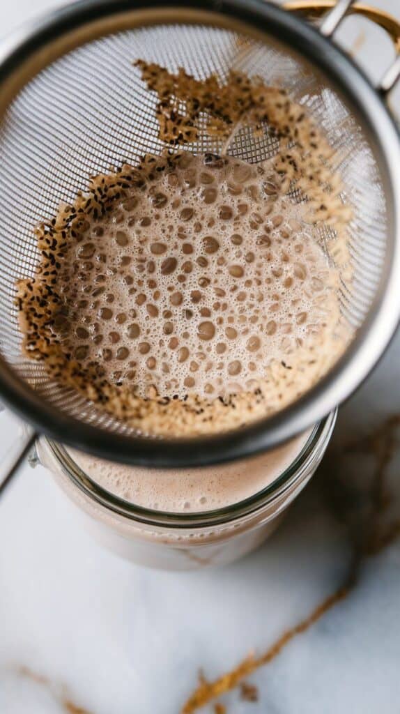 Pour the sesame milk through a fine mesh strainer to remove any grainy bits.
