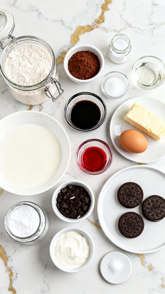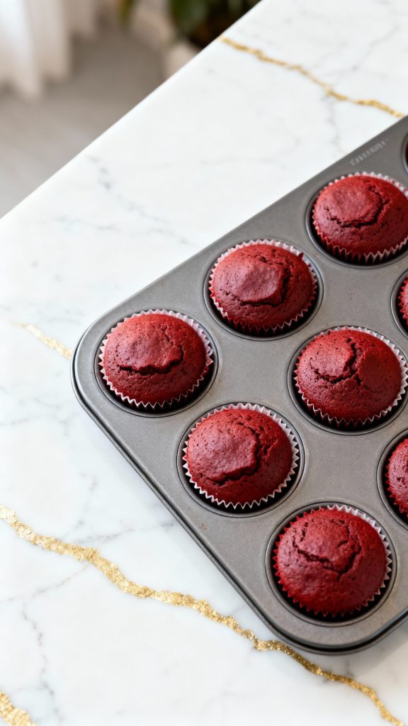 Red velvet cupcakes use cocoa powder and vinegar for that tangy flavor. The acid reacts with the baking soda to help them rise. Buttermilk adds richness and keeps the crumb tender, and the Oreo at the bottom stays slightly crisp, giving it a layered texture that’s just more fun to eat.