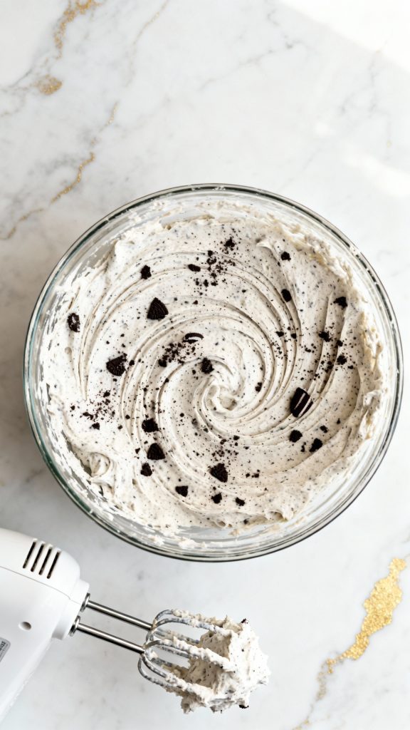 Increase to medium speed and whip for 2 to 3 minutes until the frosting is smooth and creamy. Stir in 4 crushed Oreo cookies until evenly mixed.