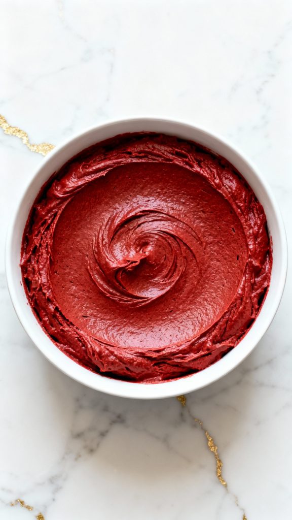 Add the dry ingredients and buttermilk mixture to the red batter in two additions, mixing gently after each one. Don’t overmix.
