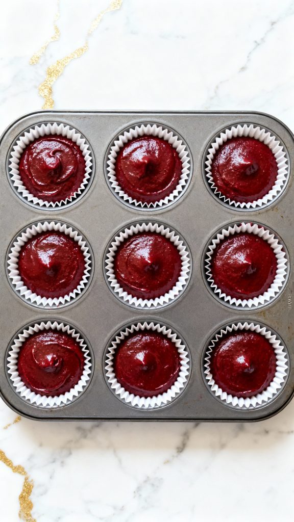 Place 12 cupcake liners in your muffin tin. Spoon or scoop the red velvet batter into each liner, filling about ¾ full.