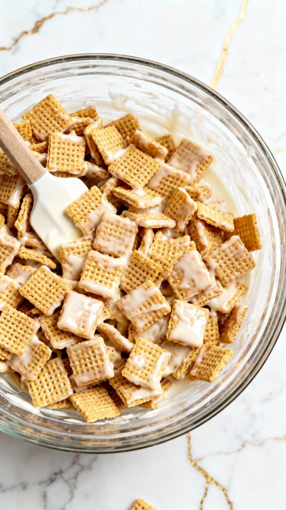 Place 6 cups of Rice Chex cereal in a large mixing bowl. Pour the melted chocolate mixture over the cereal and gently fold it in using a rubber spatula until evenly coated.