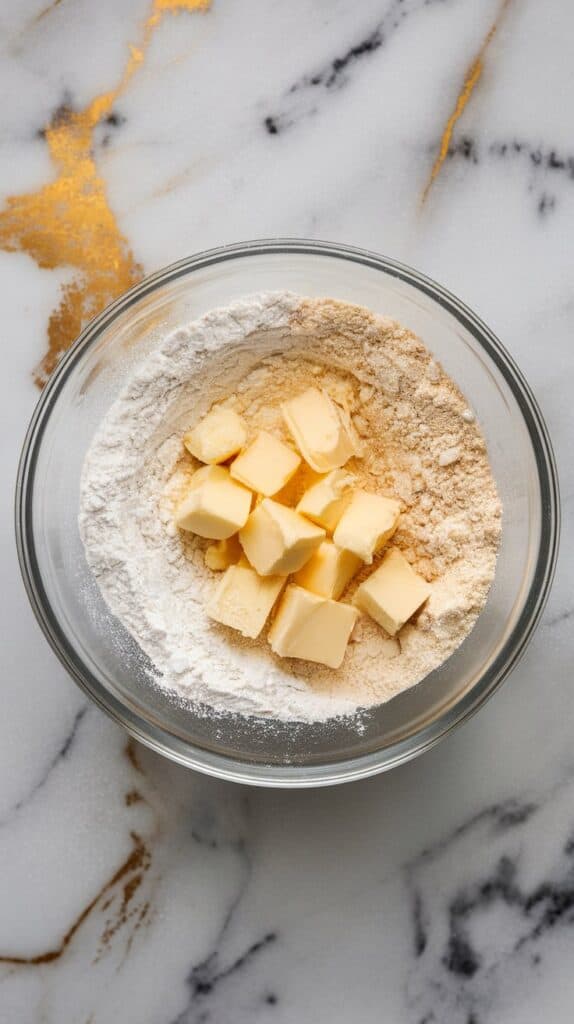 Add 1 cup (2 sticks) cold, cubed unsalted butter. Use your fingers or a pastry cutter to blend until the mixture is crumbly.