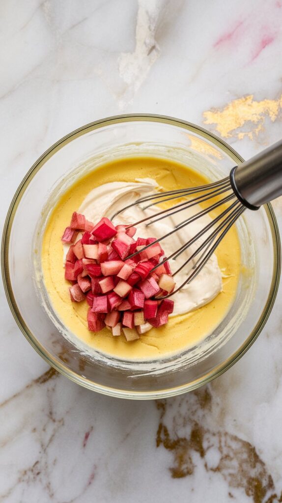 Whisk in ¾ cup heavy cream and 1 teaspoon vanilla extract. Fold in 3 cups diced rhubarb (fresh or thawed if frozen) gently.