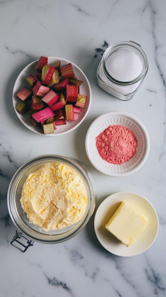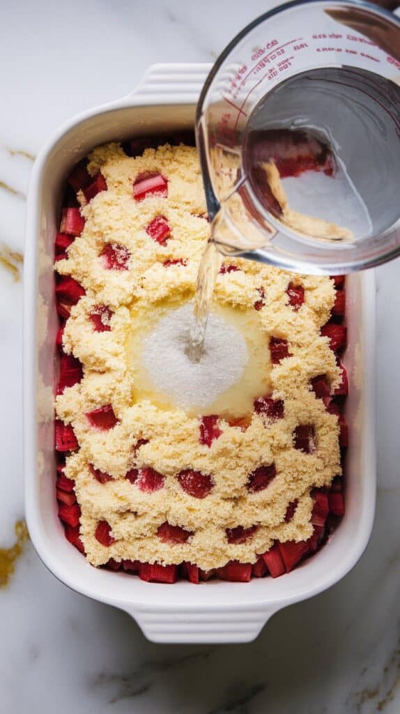 The sugar and Jello draw out the juices from the rhubarb as it bakes, creating a natural fruity syrup. The dry cake mix sits on top, absorbing steam and butter to form a crisp, buttery crust. No stirring needed—the oven handles the magic.