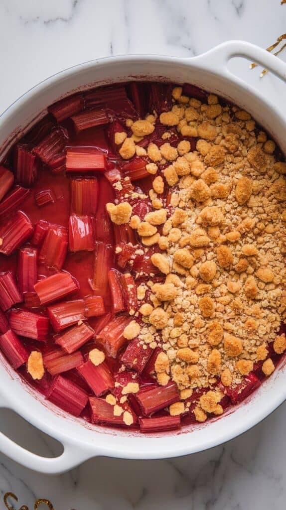 Pour the rhubarb filling into a greased 8×8″ baking dish. Sprinkle the crumble mixture evenly over the top.