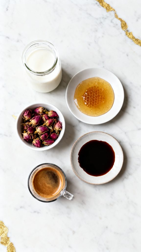 Make the rose-vanilla milk base in advance, strain it, and store it in the fridge for up to 3 days. Just reheat and add coffee when you’re ready.