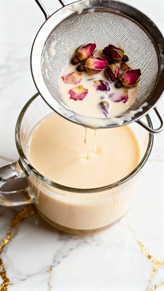 Use a fine mesh strainer to strain the milk into a mug or small pitcher, removing the rose petals.