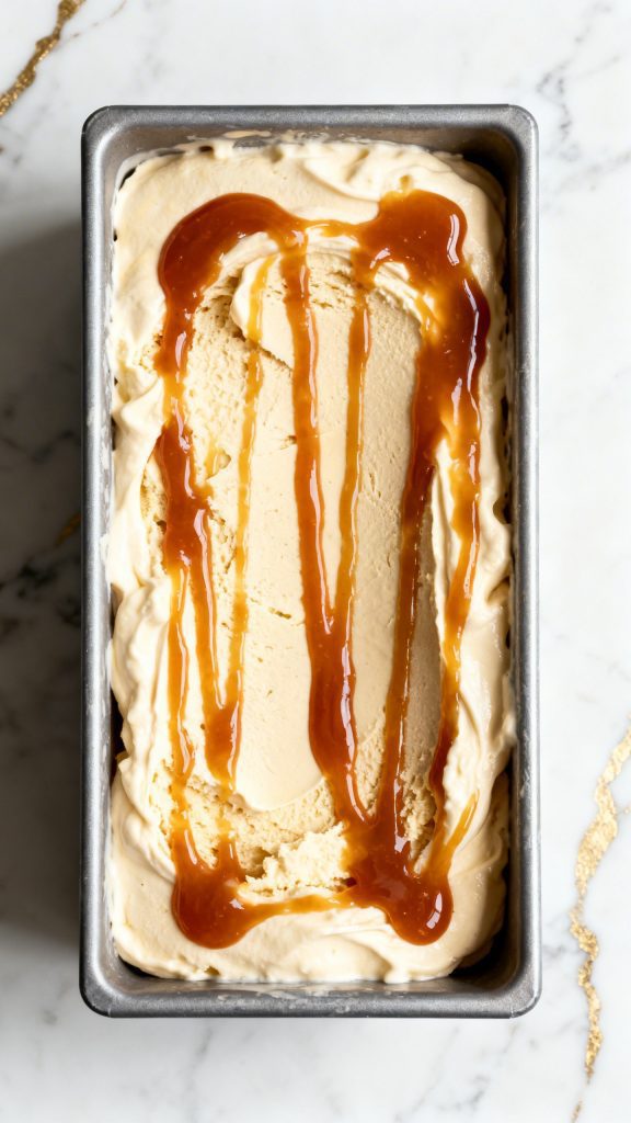 Pour the creamy mixture into a freezer-safe container. Add 1/2 cup thick caramel sauce on top.