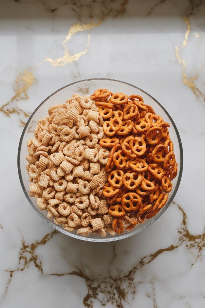 Add 6 cups Rice Chex cereal and 2 cups mini pretzel twists into a large mixing bowl.