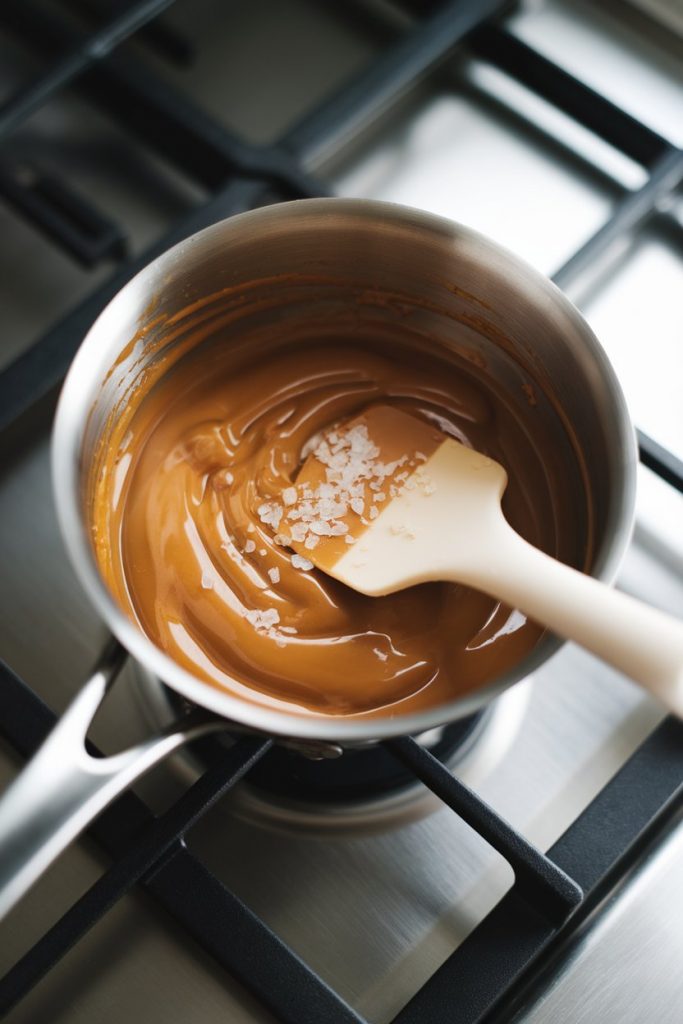 In a small saucepan, melt 1/4 cup unsalted butter and 1/2 cup caramel sauce over medium-low heat. Stir constantly until smooth and fully combined. Add 1/2 teaspoon sea salt and stir in.