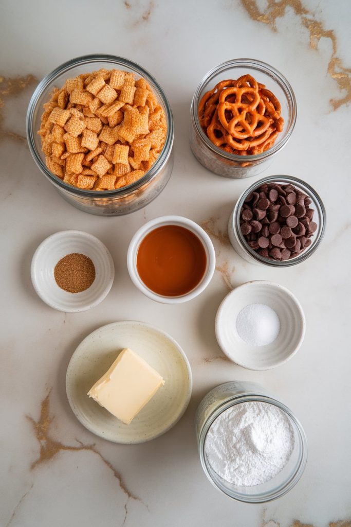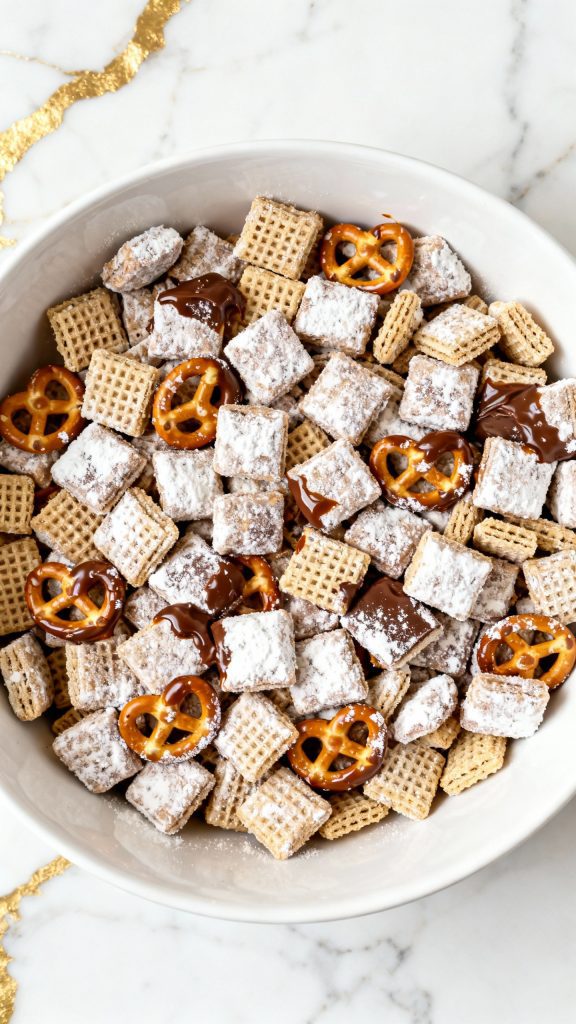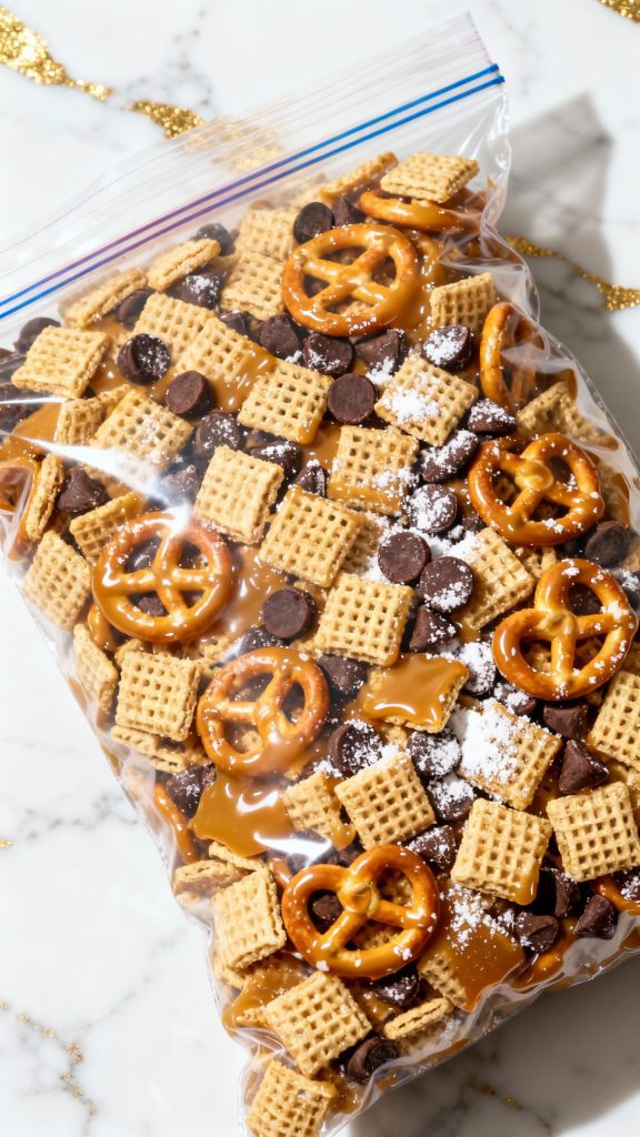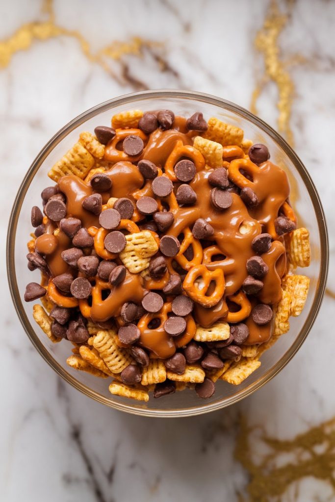 The caramel and butter melt together to create a smooth coating that clings to the Chex and pretzels. The chocolate chips melt slightly and stick to everything, adding richness. The powdered sugar sticks to the still-warm coating, creating that classic “muddy buddy” dusted look and helps separate the sticky pieces.
