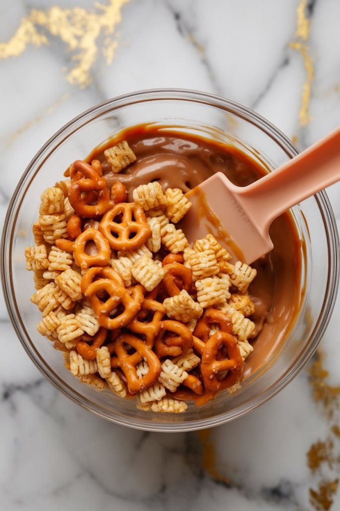 Pour the hot caramel mixture over the cereal and pretzels. Gently toss with a silicone spatula until evenly coated.