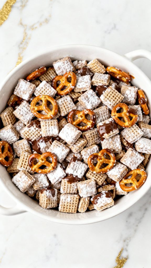 You get gooey caramel, salty pretzels, and crisp cereal all tossed in powdered sugar magic.
