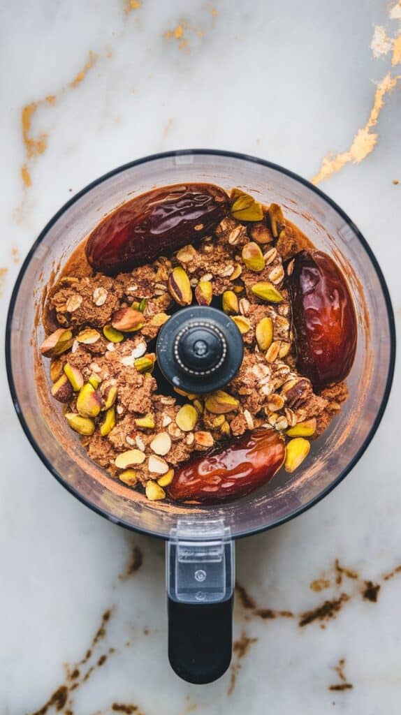 Add the pitted dates, pistachios, oats, cocoa powder, sea salt, and vanilla extract to a food processor. Blend until crumbly and sticking together.