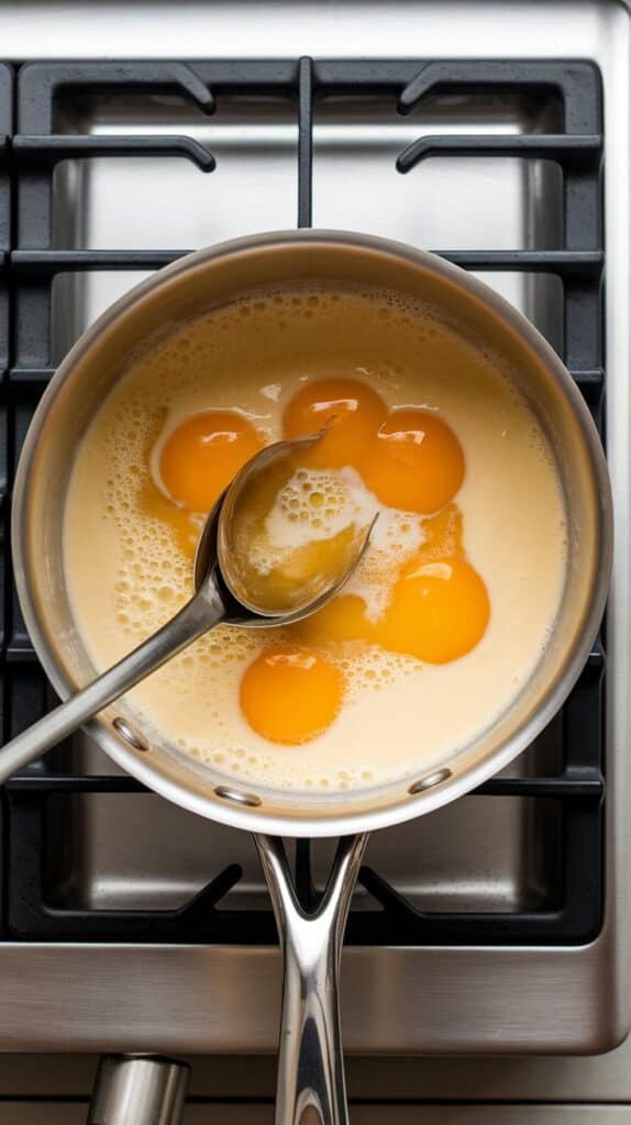 In a small saucepan over low heat, mash the steamed yolks and mix with 2 tbsp condensed milk, 2 tbsp whole milk, and 1 tbsp unsalted butter. Stir until smooth and creamy (about 3–5 minutes). Use a blender or whisk well.