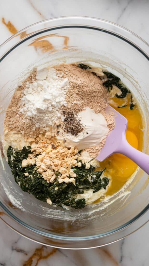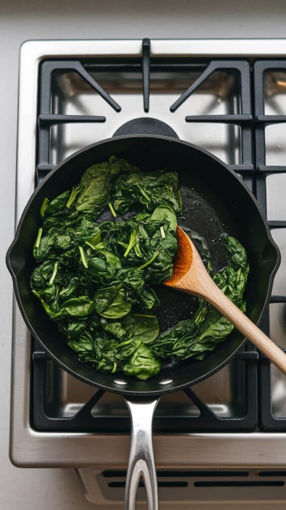 Heat 1 tablespoon olive oil in a skillet over medium heat. Add 3 cups chopped spinach and sauté for 2–3 minutes, just until wilted. Let it cool slightly.