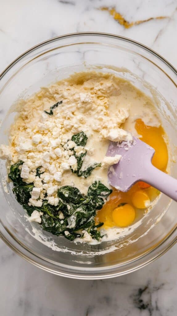 Stir in the wilted spinach and 1/2 cup crumbled feta cheese into the wet mix.