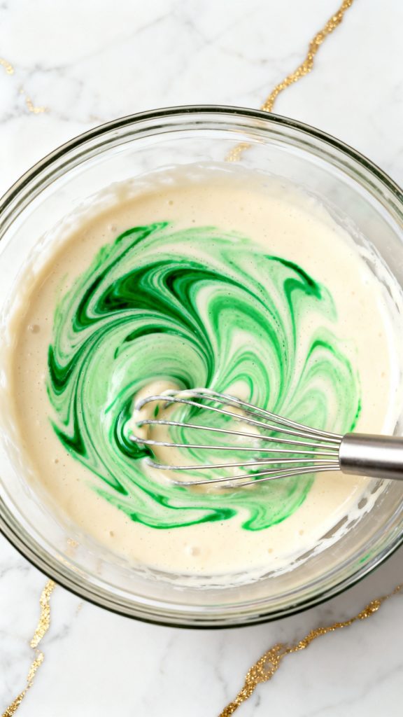 Add ½ teaspoon mint extract and 6 drops of green food coloring to the pudding. Whisk gently until fully combined and evenly green.