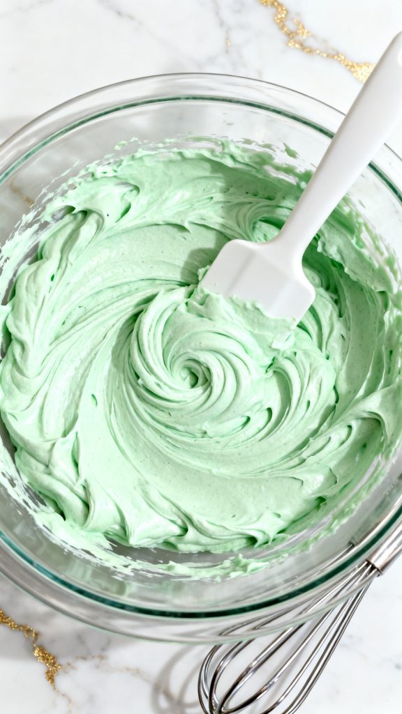Using a rubber spatula, gently fold in ½ cup of the whipped topping into the green pudding. Don’t stir too hard—you want to keep it light and fluffy.