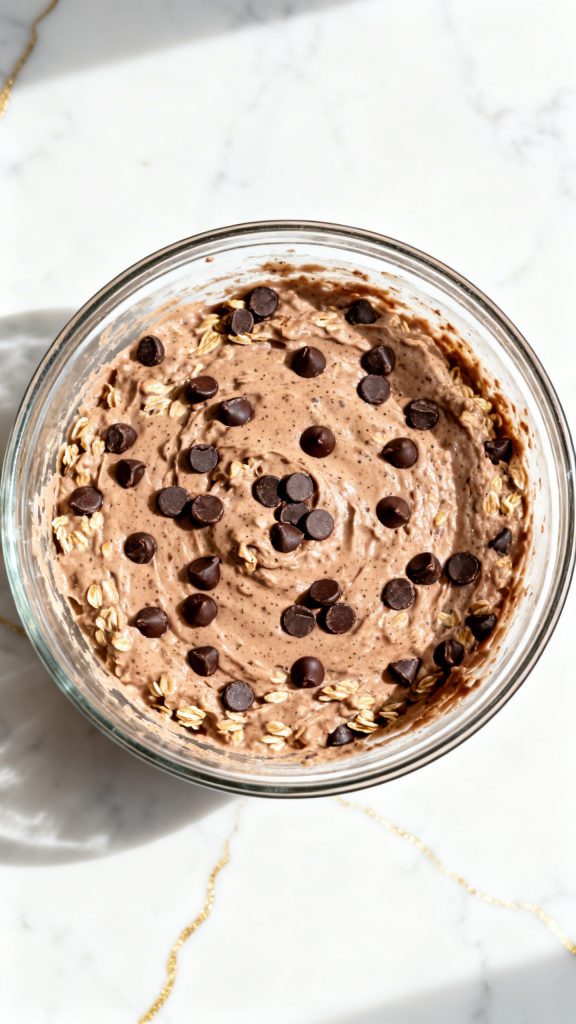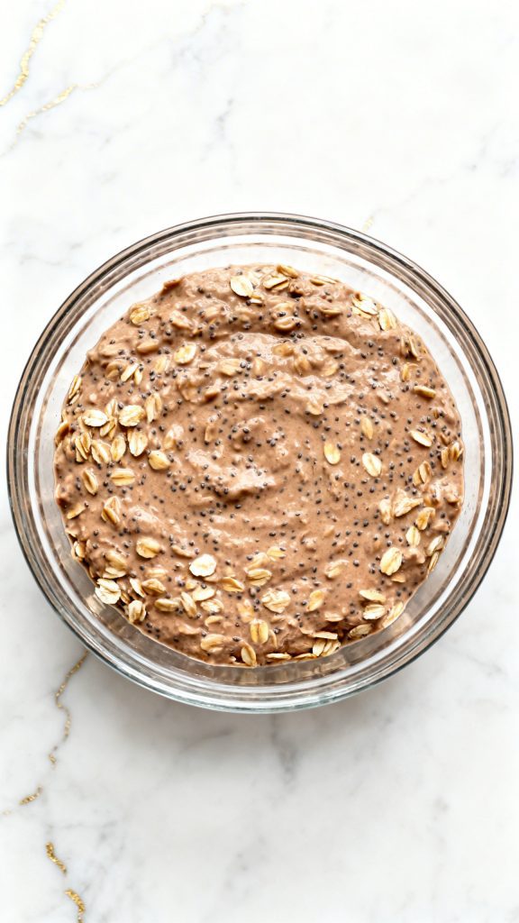 Chia seeds absorb liquid and help thicken the oats overnight. The oats soften without cooking, while yogurt adds creaminess and protein. Cocoa blends with the liquid to create a smooth chocolate base.