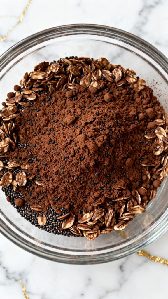 In a bowl, add 1/2 cup oats, 1 tablespoon chia seeds, and 1 tablespoon cocoa powder. Stir until combined.