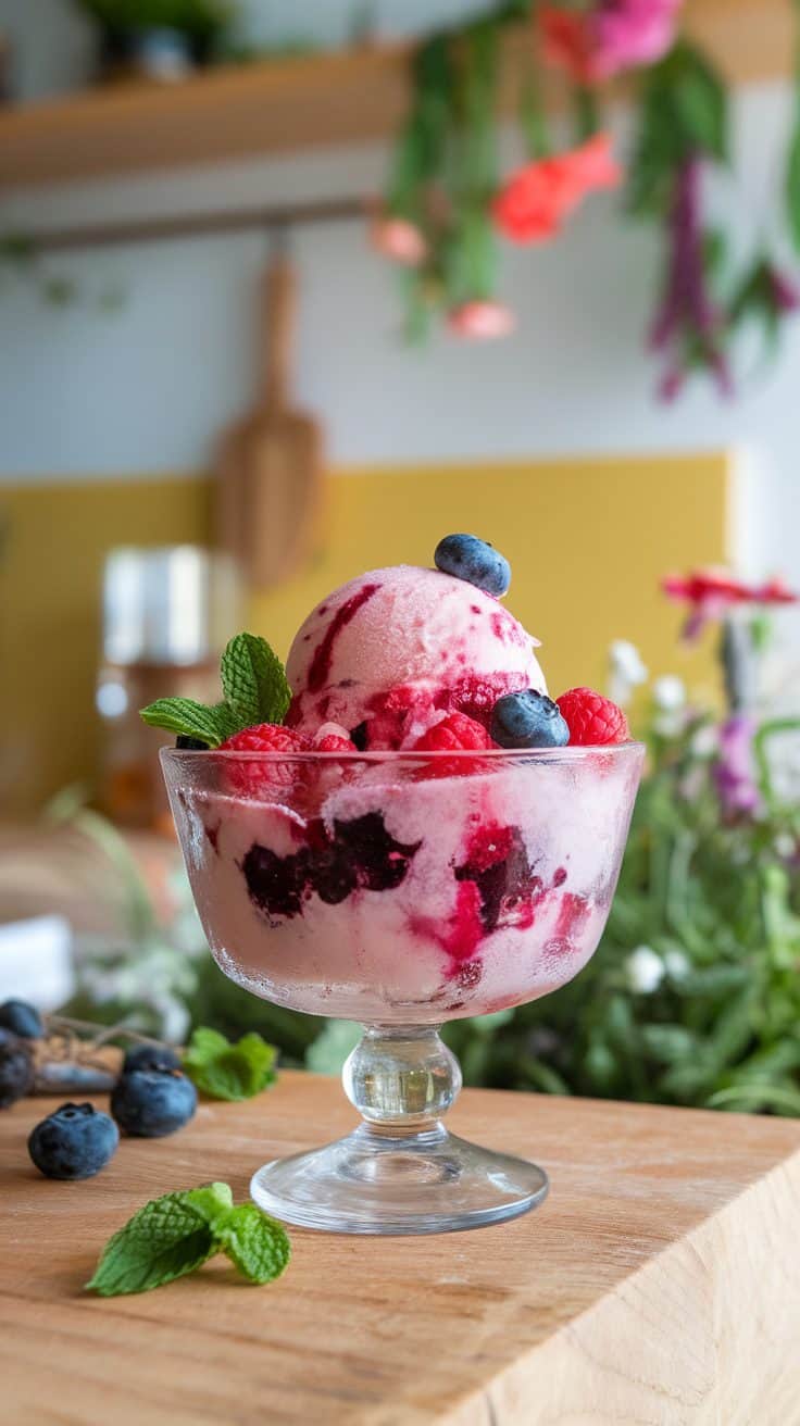 A bowl of berry burst sorbet topped with fresh blueberries and raspberries, garnished with mint leaves.