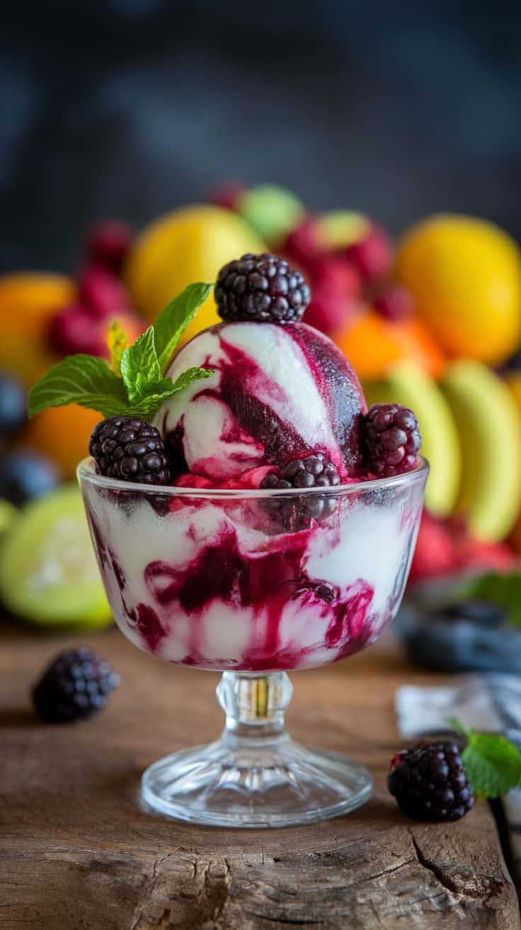 A bowl of blackberry swirl sorbet topped with fresh blackberries and mint, with colorful fruits in the background.