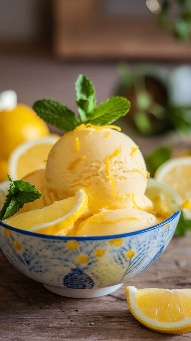 A bowl of lemon zest sorbet garnished with mint leaves and lemon slices.