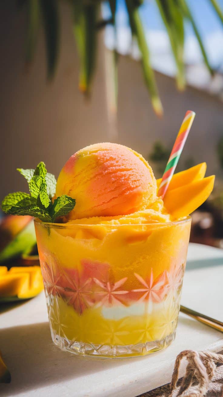 A vibrant mango sorbet served in a glass with mint leaves and mango slices.