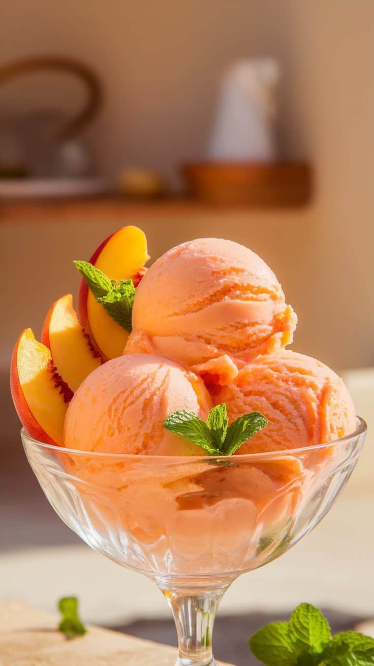 A delicious bowl of peach sorbet topped with fresh peach slices and mint leaves.