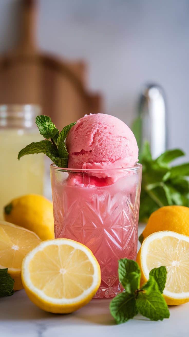 A glass of pink lemonade sorbet topped with mint leaves, surrounded by fresh lemons and mint.