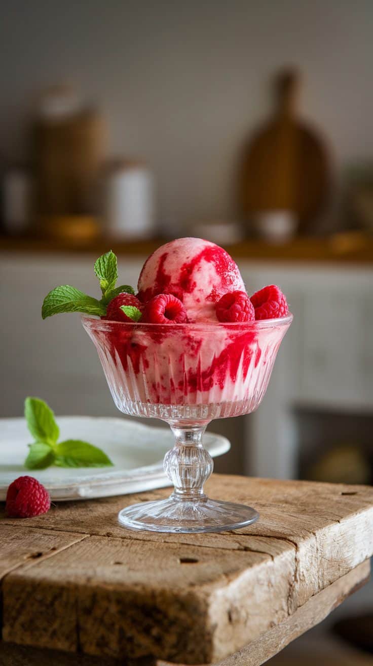 A bowl of Raspberry Ripple Sorbet topped with fresh raspberries and mint leaves.