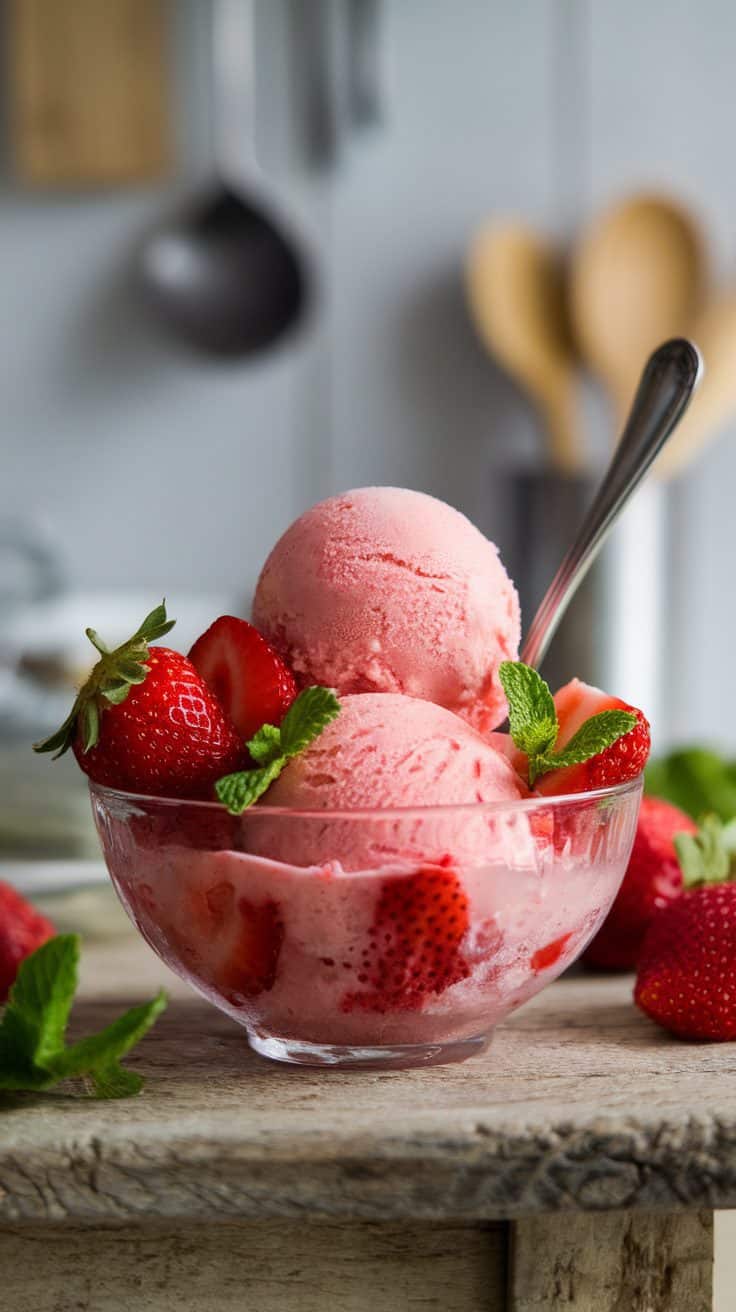 A bowl of strawberry sorbet garnished with fresh strawberries and mint leaves.